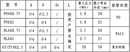 潤滑系統用的油管可分硬管和軟管。硬管的材質可為銅管、鋁管、不銹鋼管等。用戶聯接潤滑系統時應保證油管切口平整且為垂直軸心線的橫截面,油管內壁應清潔。軟管可根據潤滑系統的工作壓力選擇PU**型管、NL**型管、GY**型高壓軟管及GYT**型彈簧護套高壓軟管等。 技術參數