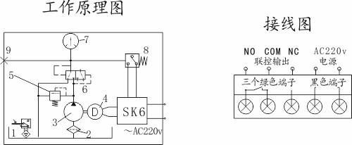 二、工作原理 “GP268”智能泵工作原理:將間歇時間設定后,即進入間歇計時狀態,中途斷電再次通電后繼續遞減計時,累計計滿預設的間歇時間。“SK6”型控制器確認常開型壓力開關 8復位的前提下(斷態信號,通態報警),控制電機4運轉驅動齒輪泵3泵油,經自動換向閥6壓送至輸出口9輸往潤滑系統。當系統分油結束,壓力上升到壓力開關動作壓力時,“SK6”型控制器指令油泵電機繼續運轉10秒鐘(這是保壓時間,可調)。期間系統壓力穩定到溢流閥5的調定壓力(保壓)。停泵時,換向閥6在差壓信號的作用下恢復至左位機能,溝通主管路卸荷通道。系統壓力卸壓。油箱油位下降到下限位置時,油位開關1發通態信號。額定壓力由調壓閥5控制,壓力表7顯示。