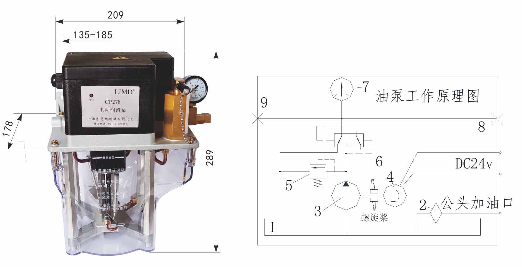 CP278型電動油脂泵是一種電機驅動齒輪泵,屬于順置式結構:電機設在上方,油箱及泵芯設在下方。內含自動卸荷閥、調壓閥、攪拌及壓送油脂的螺旋槳等,屬間歇工作泵。用于需周期工作的容積式定量集中潤滑系統。電動泵的工況受外來指令控制,得電泵油,失電停泵及自動卸壓。 電源電壓:DC24v,額定功率≤120w;額定壓力5.0MPa;額定流量120ml/min。適用潤滑介質:000#、00#、0#油脂。 “CP278”電動泵工作原理:電機采用雙動力輸出,外圈低速旋轉驅動螺旋槳及攪拌棒,用于攪拌及壓送油脂,解決油脂凝固及起助吸作用;內圈高速旋轉驅動泵芯泵油。 電機1得電,內圈高速動力驅動泵芯3運轉,從油箱1吸入油脂,泵出高壓油源。再經自動換向閥6壓送至輸出口8和9輸往系統。電機失電,停止泵油。自動換向閥6在差壓信號的作用下恢復至左位機能,溝通主管路卸荷通道。系統壓力由調壓閥5控制,壓力表7顯示。